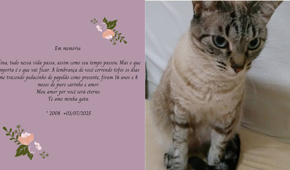 Nina, tudo tem seu tempo nessa terra, e o seu passou. Você partiu para céu e será a estrelinha mais brilhante do céu, minha gatinha linda, saiba que continuo te amando e com muita saudades, foram 16 anos e 8 meses que Deus nos permitiu vivermos juntas. Vai ficar as lembranças de todo dia você trazendo um pedacinho de papelão como presente. Nunca te esquecerei, pois já mais morre quem vive em nossa memória. Siga na paz, e eu sigo firme na esperança de um dia Deus proporcionar o nosso reencontro na eternidade.